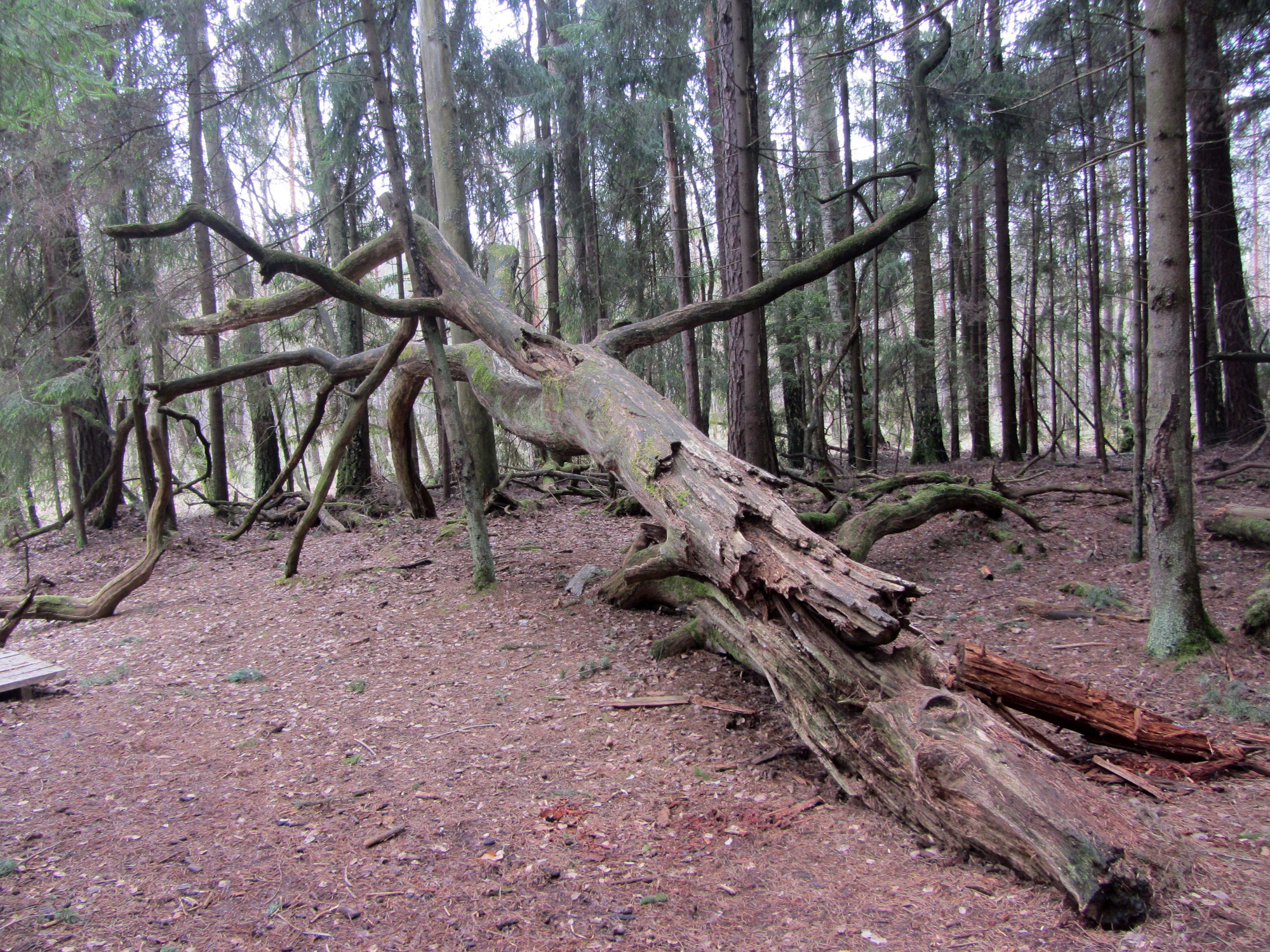 Pateiksime medžių skaičiaus pasiskirstymo pagal skersmenis ir būklę – augantys, žuvę, pilnai suirę – sąvadą stebėjimo pradžioje (1987) ir pabaigoje (2021). Labiausiai pagal medžių skaičių yra pažeidžiami ploniausi, tiek pušies, tiek eglės medžiai. Ploniausių medžių mediena taip pat greičiausiai suyra. 34 metų laikotarpyje žuvo 27 proc. pušies ir 63 proc. eglės medžių. Visiškai suiro tik 8 proc. visų žuvusių pušies ir 48 proc. visų žuvusių eglės medžių.